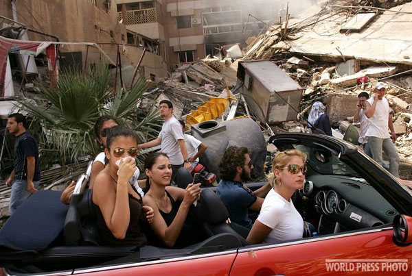 Молодые ливанцы проезжают через разрушенный израильской армией в ходе операции против боевиков Хезболлы, 15 августа 2006