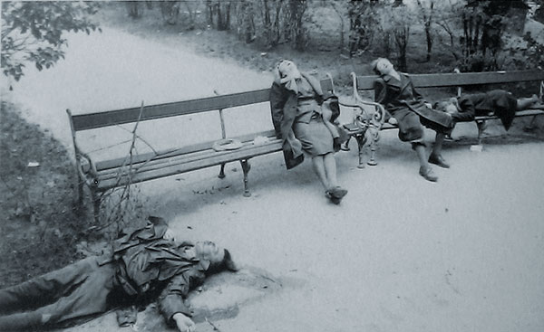 Смерть нацистского функционера и его семьи. Вена, 1945 г.Евгений Халдей: “Я пошел в парк у здания парламента, чтобы снять проходящие колонны солдат. И увидел эту картину. На скамейке сидела женщина, убитая двумя выстрелами – в голову и шею, рядом с ней мертвые подросток лет пятнадцати и девочка. Чуть поодаль лежал труп отца семейства. На лацкане у него был золотой значок НСДАП, рядом валялся револьвер. (…) Подбежал вахтер из здания парламента: