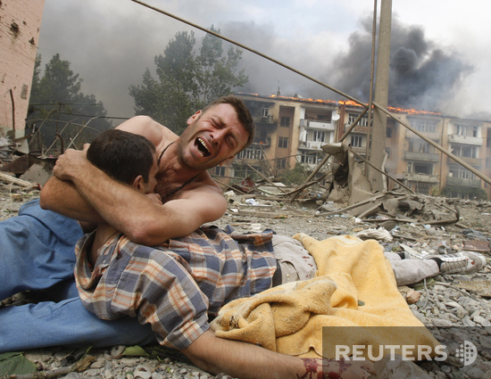 Грузинский мужчина оплакивает своего брата после бомбардировки Гори российской авиацией. Август 2008 года